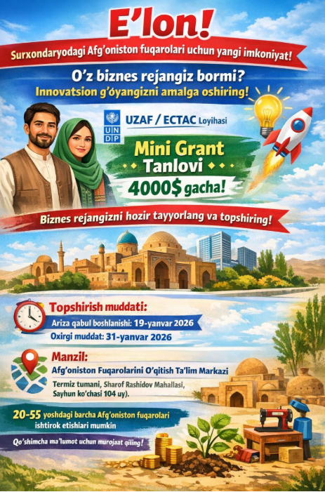 BatafsilSURXONDARYO VILOYATIDAGI AFG‘ONISTON FUQAROLARI UCHUN YANGI IMKONIYAT!O’Z BIZNES REJANGIZ BORMI? INNOVATSION G’OYANGIZNI AMALGA OSHIRING! BMT Taraqqiyot Dasturi (UNDP) tomonidan Yevropa Ittifoqi bilan hamkorlikda amalga oshirilayotgan UZAF/ECTAC (“Surxondaryo viloyatining Afg‘oniston fuqarolarini o’qitish va kasbiy tayyorlash salohiyatini oshirish”) loyihasi “Startap” biznes g‘oyalarini rivojlantirish uchun mini grantlar (4000$ gacha!) tanlovini e’lon qiladi! Loyiha haqida qisqacha: ECTAC loyihasi (2022–2026)…